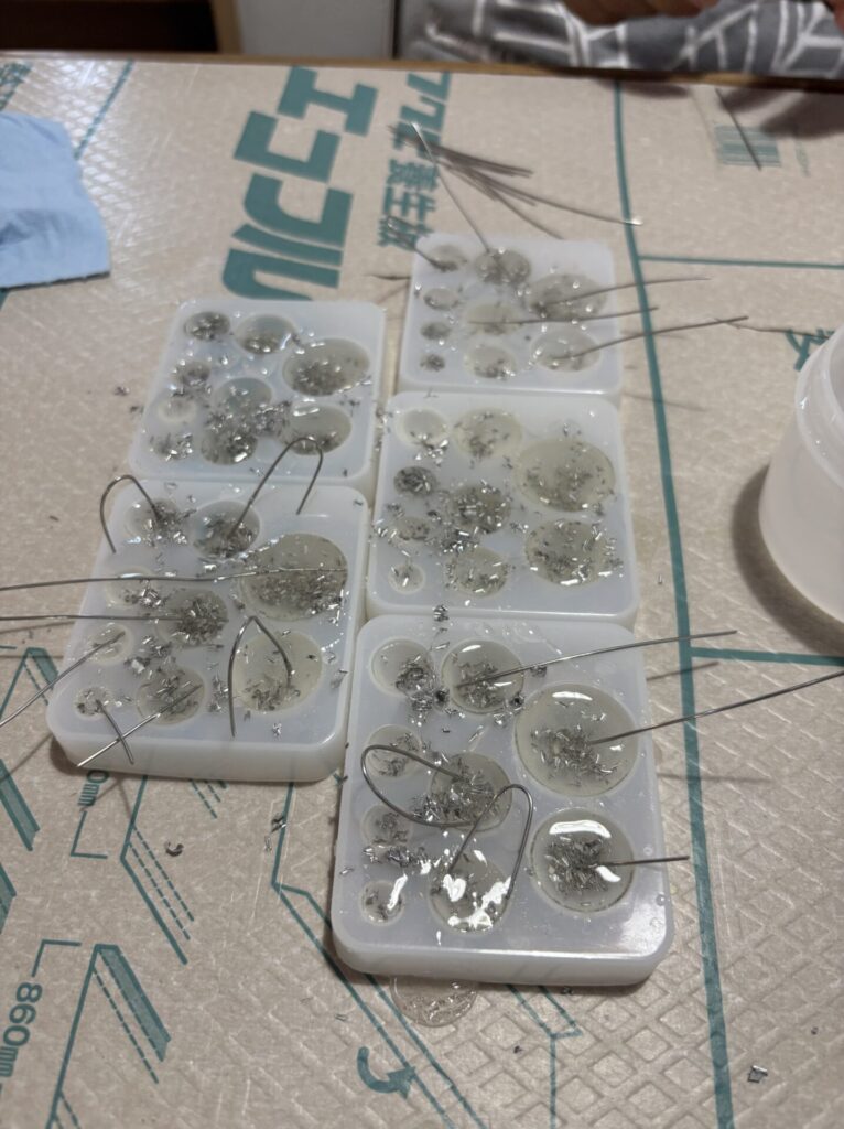 端材で製作するという事が今回のコンセプトの一つでした。子供たちに触っていただくので、金属をどの様に加工すればよいか?非常に悩みました。金属の粉をレジンで固める事で、安全性を担保しつつ端材をきれいに見せることが出来ました。なおレジンはシャープ化学工業様から頂いたものを使用させていただきました。