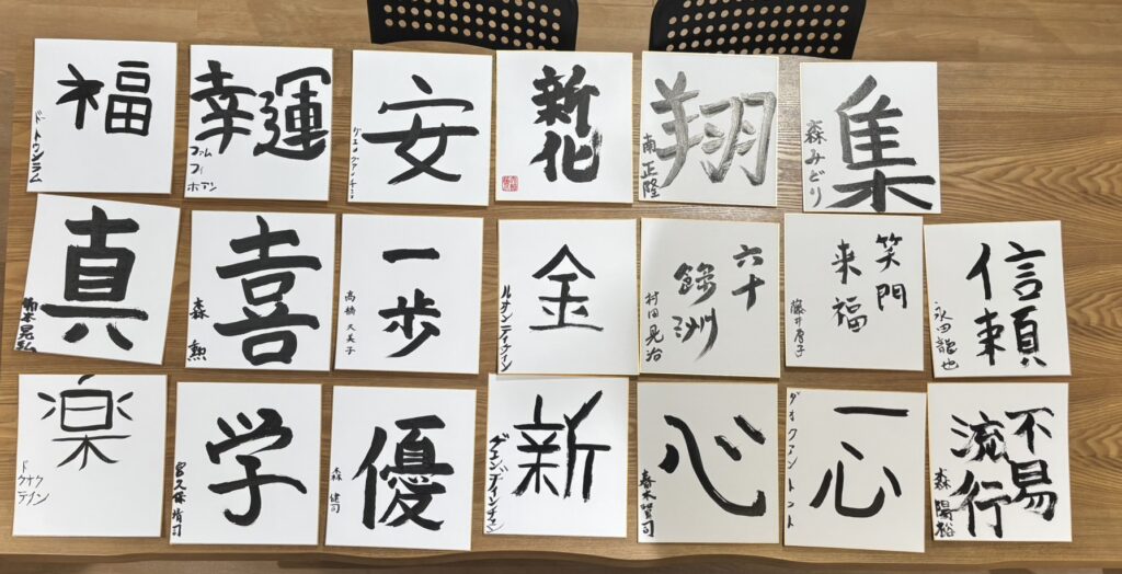 また、関西貿易で書初めも行っております。毎年その人が思う言葉を書いています。大人になってから書初めを行う機会は少ないです。というかこの機会しかございません…なので意外と楽しみでもあったりします。半紙ではなく色紙に書くのも新鮮だったりします。出来上がった書初めは、食堂に掲示していますので弊社にお越しいただいた際は、是非ご覧ください。